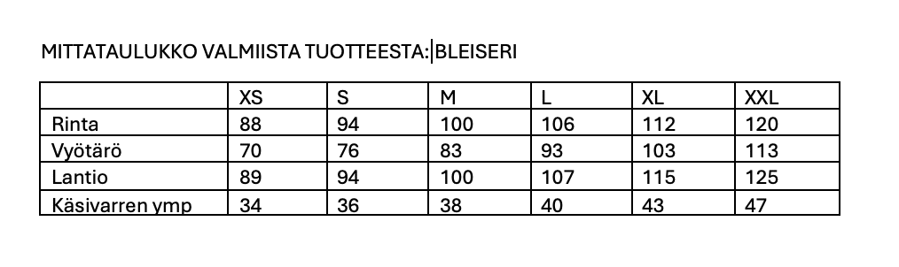 - Jos haluat bleiserin erityisen lyhyillä tai pitkillä hihoilla, se onnistuu myös helposti! Mainitse vaan tällöin tilatessa haluttu hihan mitta.